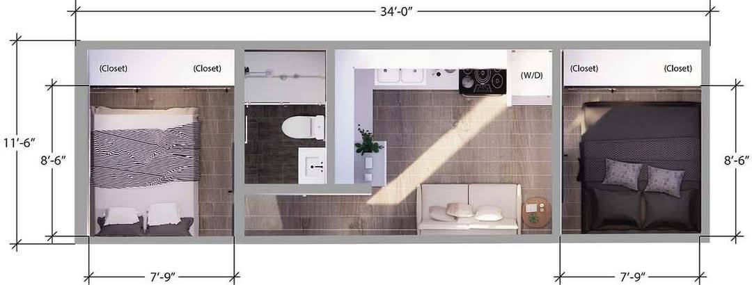 This home offers (2) identical bedrooms on either side. The space between offers a bathroom and large living/kitchen space. The home is taller but only one level so as to allow for the placement of higher windows for privacy and adding natural lighting.